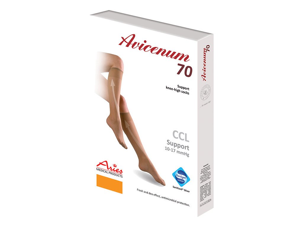 Zdravotní lýtkové punčochy první kompresní třídy Avicenum 140 zmírňují projevy počínající žilní nedostatečnosti a pocity únavy, otoky a napětí v nohou. Antimikrobiální úprava se švýcarským stříbrem SanitizedR Silver zabraňuje vzniku mikroorganismů a nepříjemných pachů.Kompresní třída: I